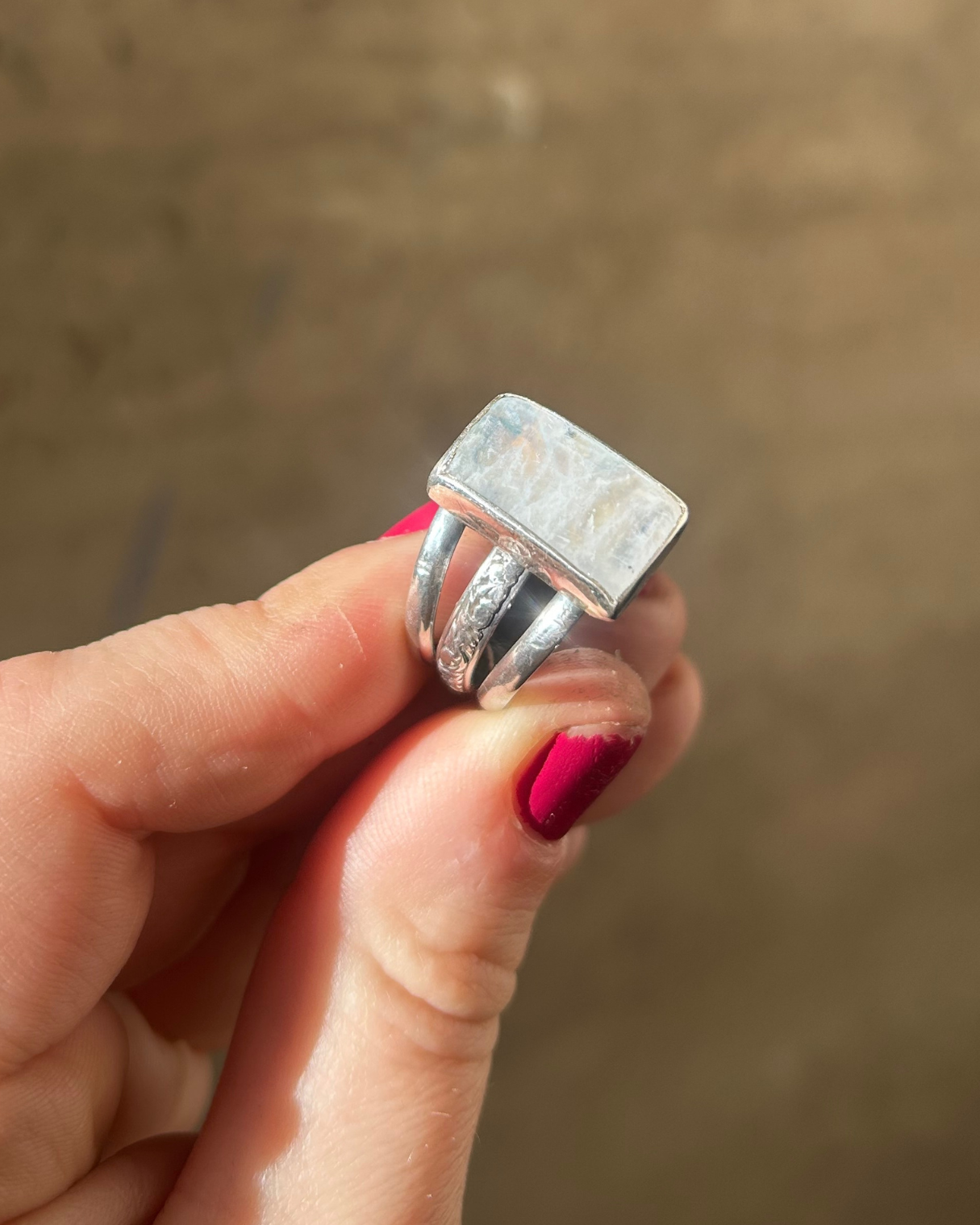 This ring centers a glowing moonstone in a bold, beveled edge bezel — a detail that gives the stone both protection and presence. The setting rises from a triple-band split shank, each band formed in solid sterling silver, one accented with patterned wire for subtle texture and depth.
