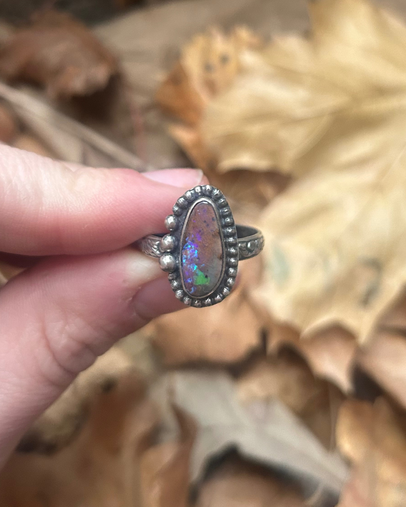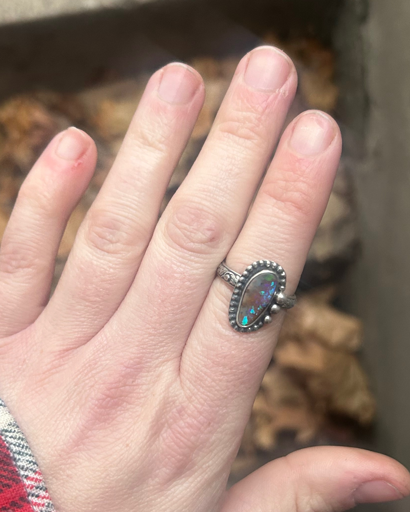 A moody, luminous boulder opal wrapped in a decorative sterling silver setting. This stone shows its best flashes—greens, blues, purples—when caught in sunlight, giving the ring a subtle, shifting magic that changes throughout the day.