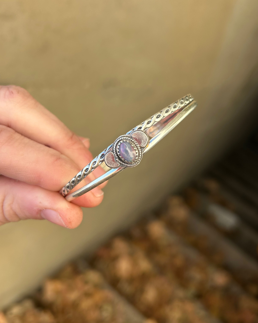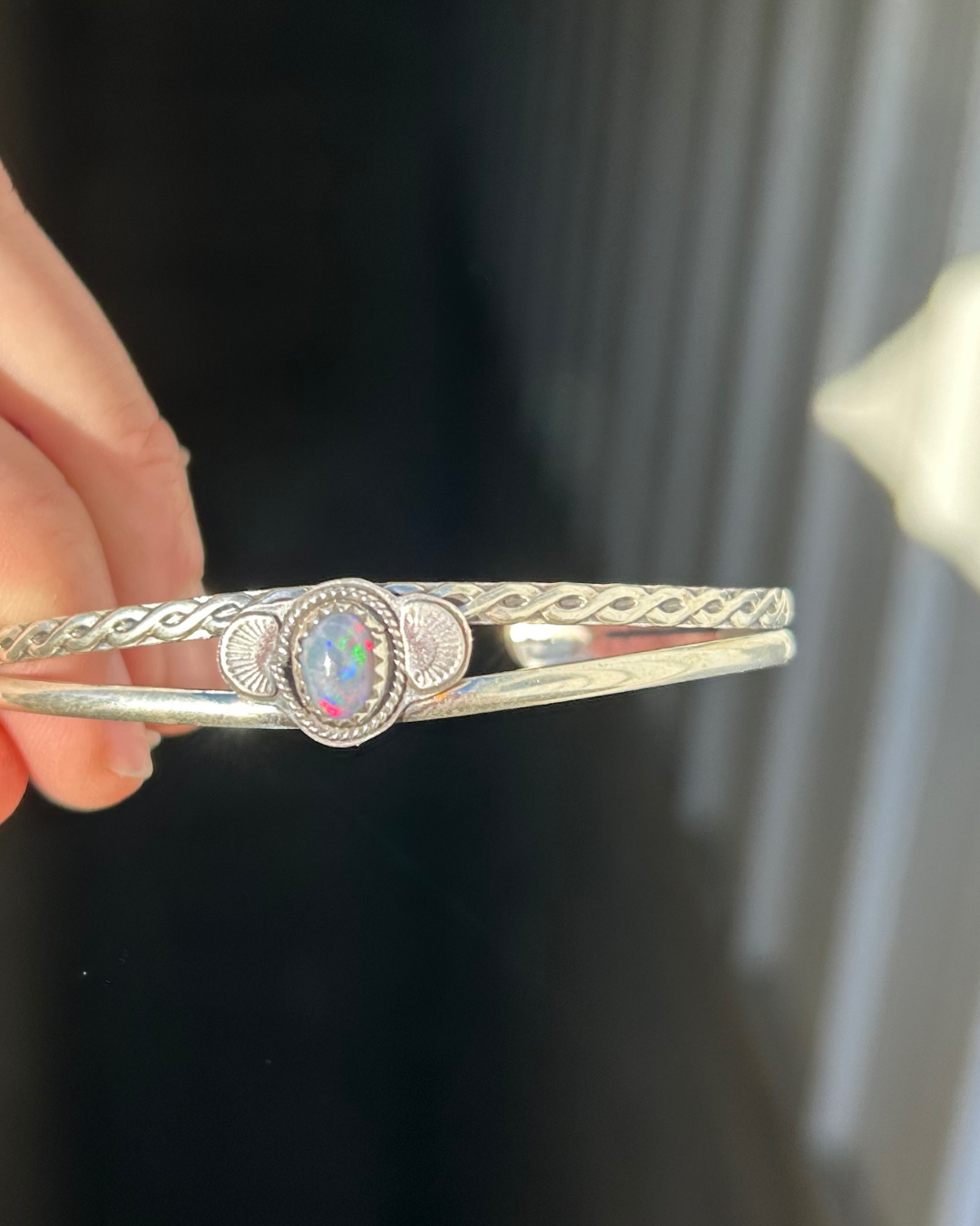 Hand-fabricated in solid sterling silver, this piece blends heirloom craftsmanship with a soft, feminine shape. A braided silver band and smooth half-round band meet at the centerpiece, drawing the eye toward the bezel-set opal framed with delicate hand-stamped accents.