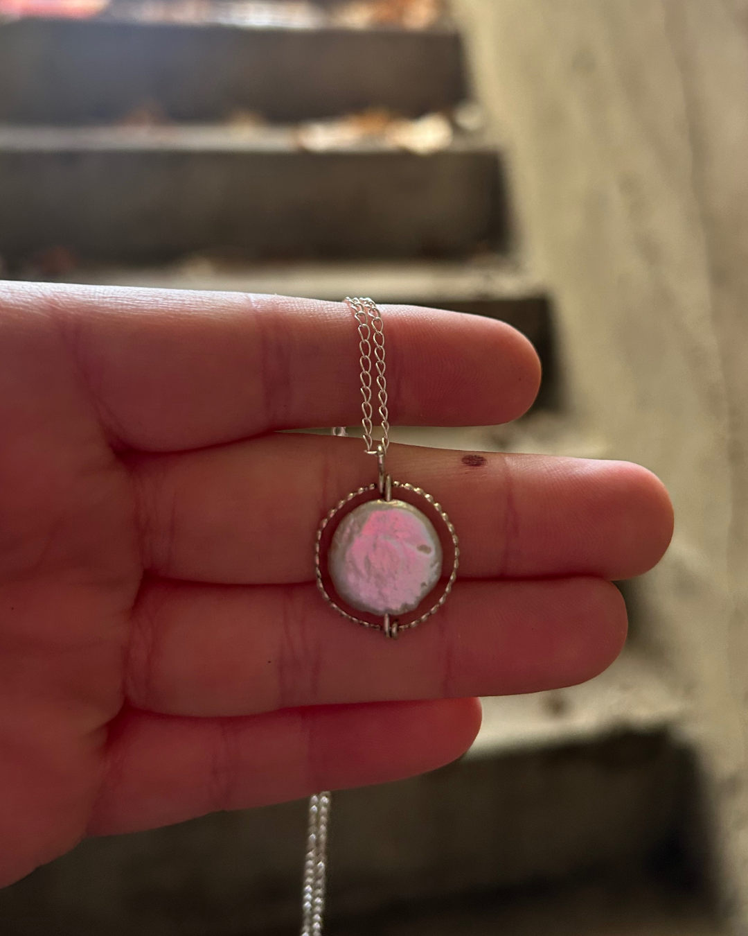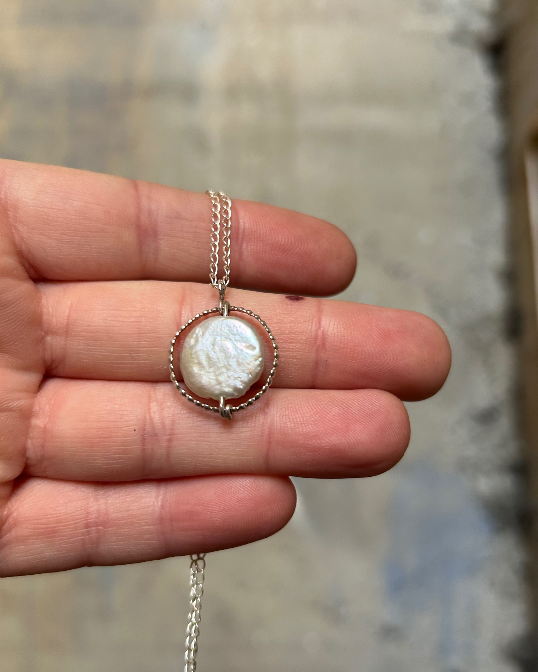 A soft, luminous baroque pearl sits suspended in a hand-formed beaded halo — a piece that feels both ancient and modern. This necklace is made with an intentionally delicate chain that lets the pearl take center stage. Each baroque pearl forms naturally, which means no two will ever be alike. This one glows with soft pinks, blues, and cream tones that shift as the light moves.