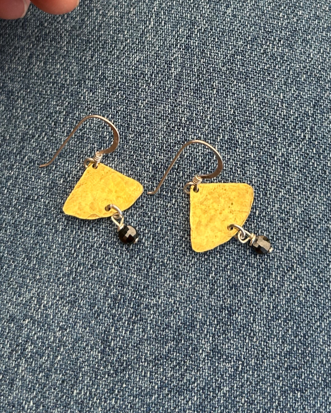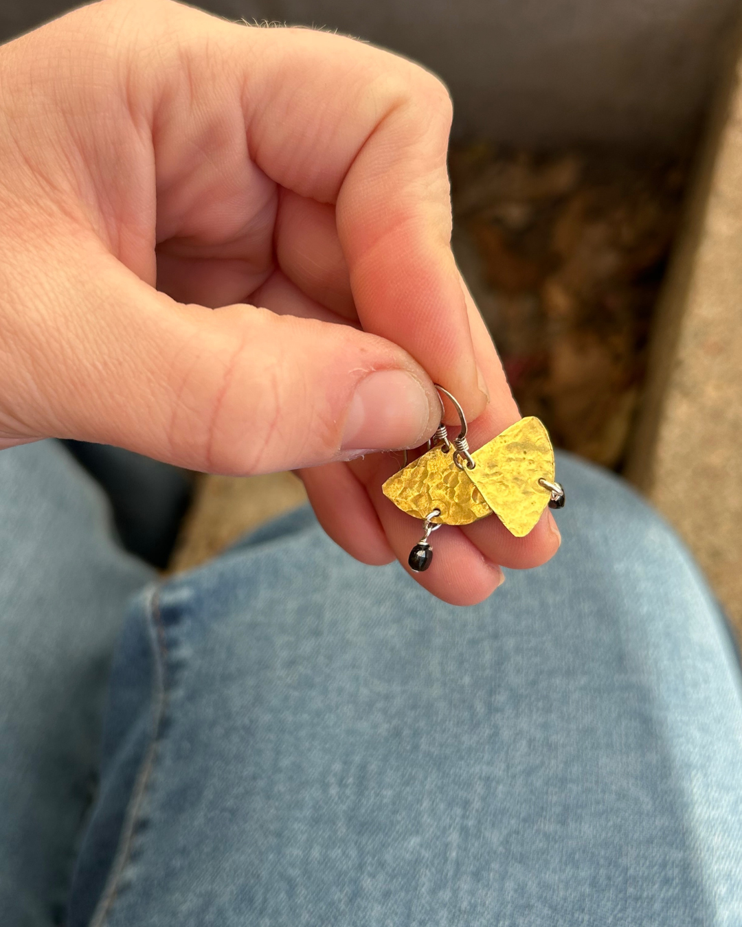 Hand-cut from warm golden brass and hammered for soft texture, these lightweight fan earrings bring just the right amount of shine. Each pair features a petite faceted black spinel drop—adding a subtle hint of depth and contrast.