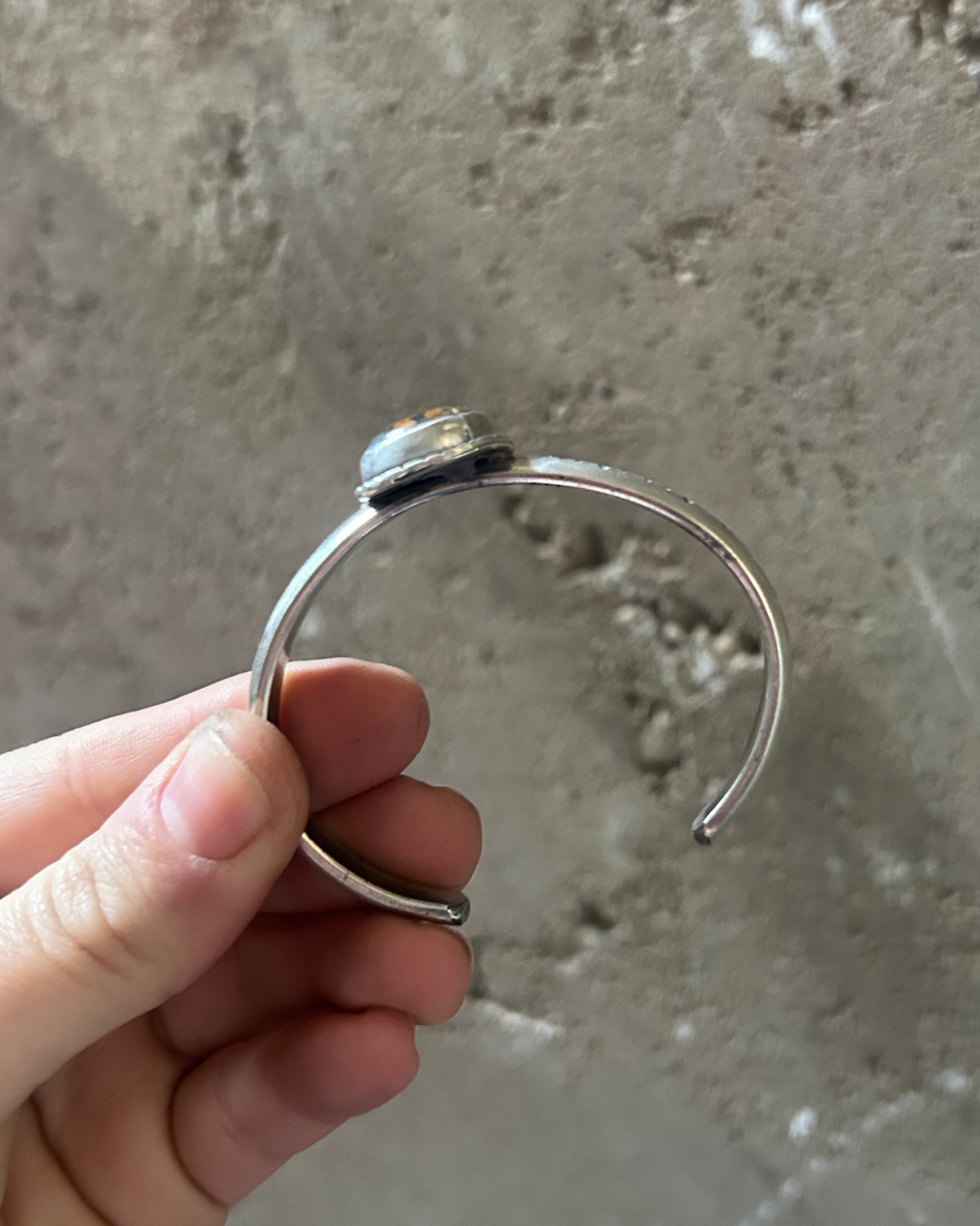 A substantial, hand-forged sterling silver cuff built around a striking warm-toned turquoise cabochon with golden and charcoal matrixing. The stone has that desert-sun glow—rich, earthy, and full of character—paired with a very hefty 2-gauge band that feels powerful on the wrist.