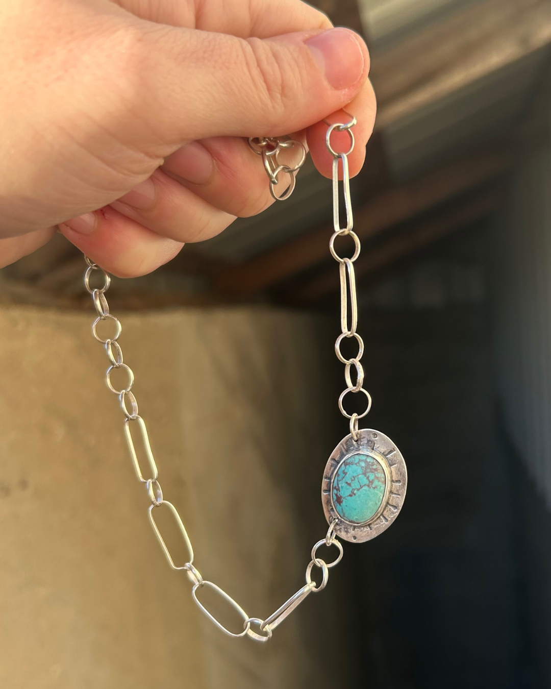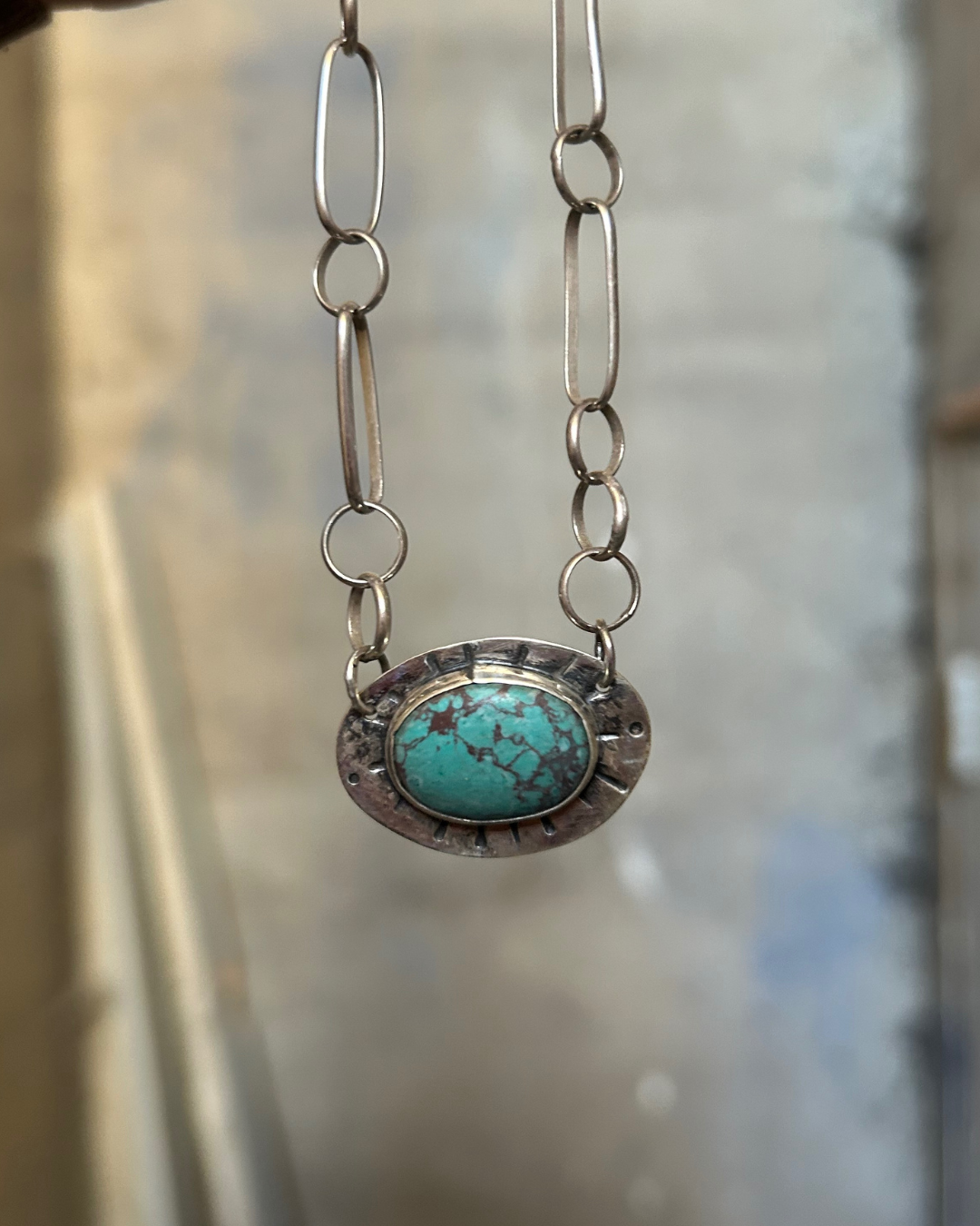 A truly one-of-a-kind turquoise necklace, entirely hand-fabricated from sterling silver. The centerpiece features a beautifully webbed turquoise stone framed against a satin-finish, hand-stamped sunburst backplate.