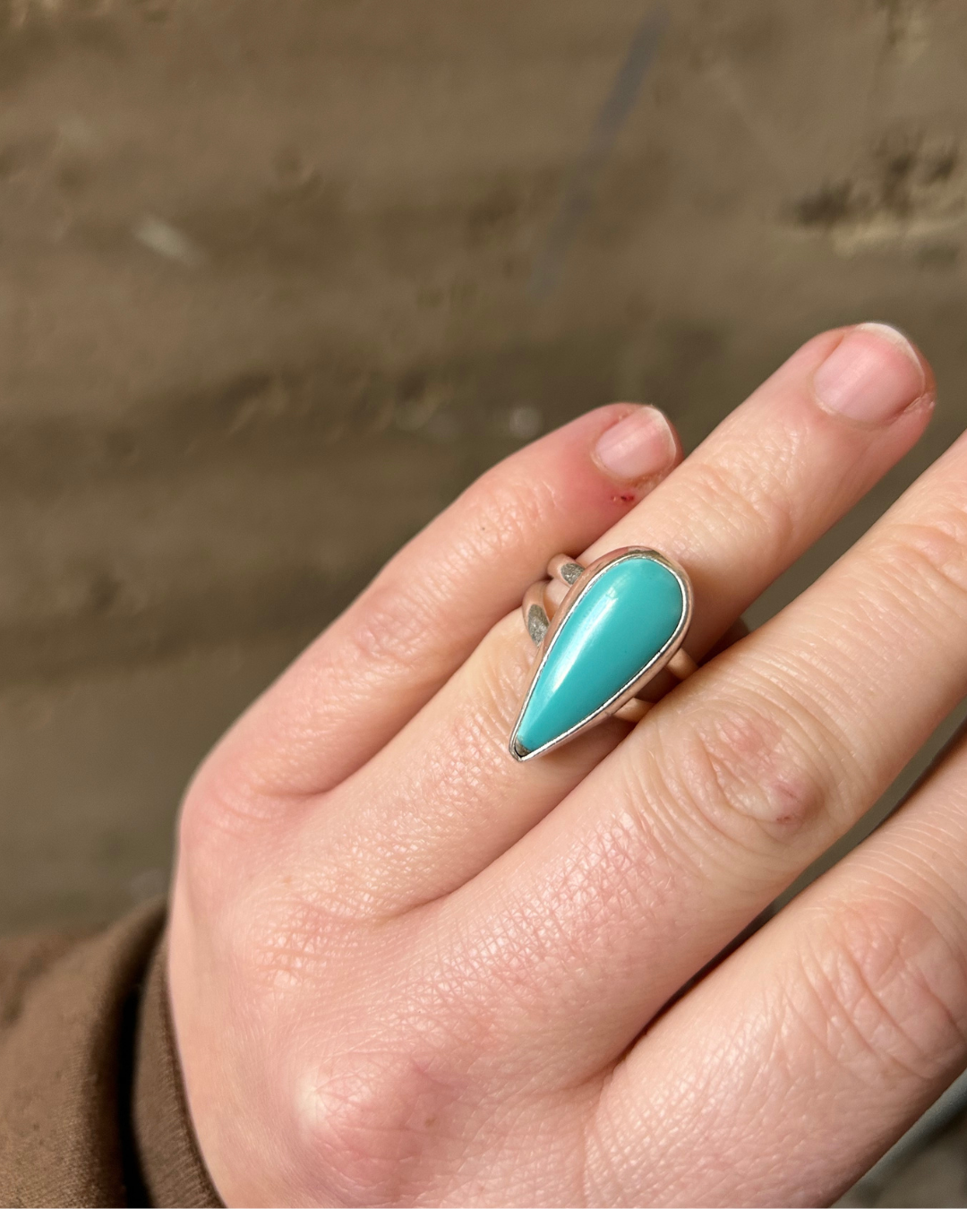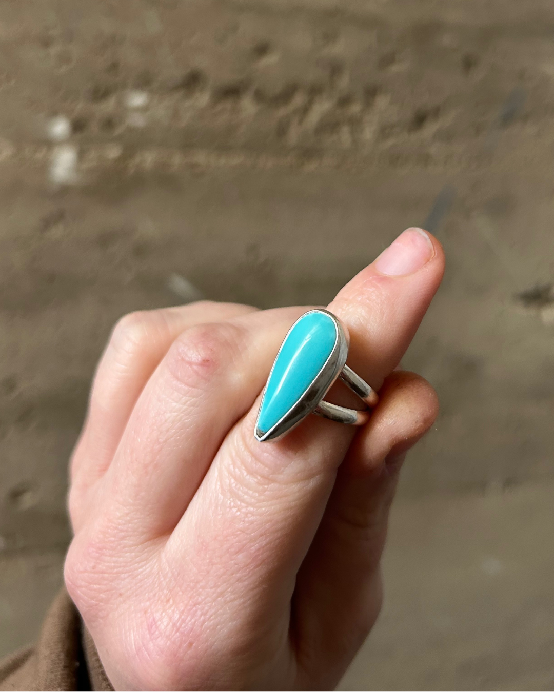 A clean, modern statement piece featuring a vibrant teardrop Kingman turquoise in a full high-polish silver setting. The elongated silhouette is flattering on every hand, and the double split-shank band adds balance without bulk.