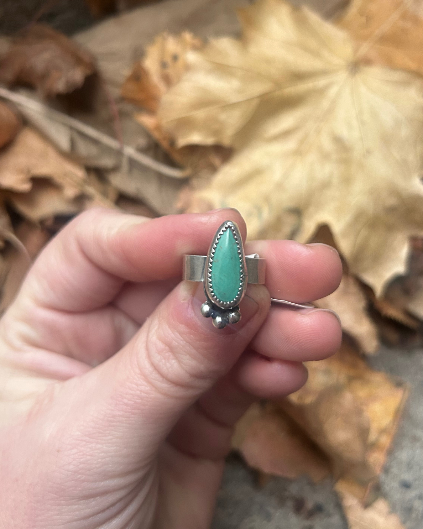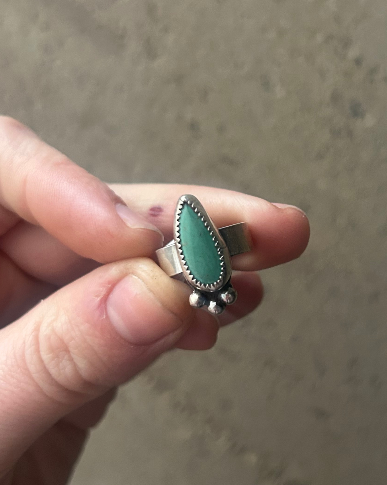 A hand-forged Kingman turquoise ring built on a bold, wide sterling silver band — simple, sturdy, and designed to be worn for years. The stone features that classic Kingman blue-green tone, set in a serrated bezel and accented with three handmade sterling silver balls for a subtle, vintage-inspired feel.