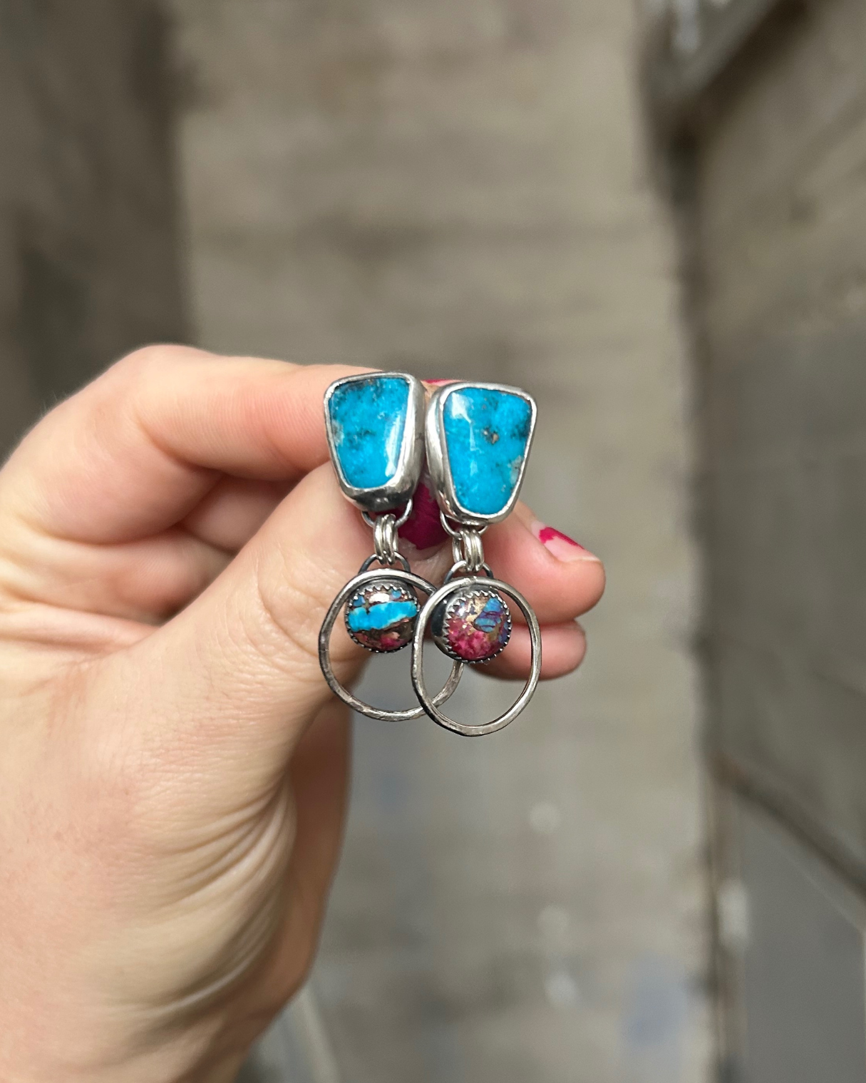 These earrings pair the grounded presence of Mexican turquoise with the warmth and depth of spiny oyster turquoise, creating a balance of earth and fire in solid sterling silver.