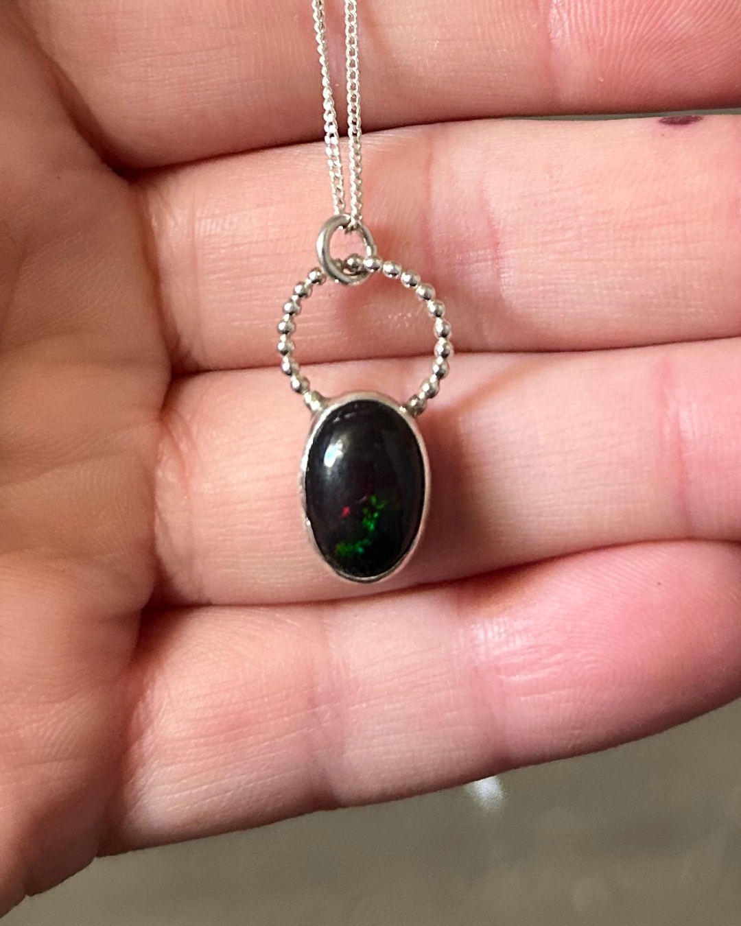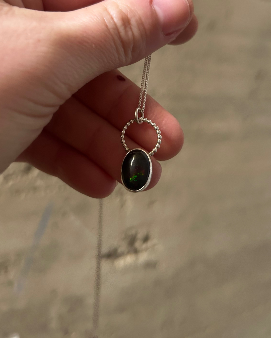 Set in a smooth sterling bezel with a delicate beaded arch bail, this necklace brings subtle drama and effortless elegance.