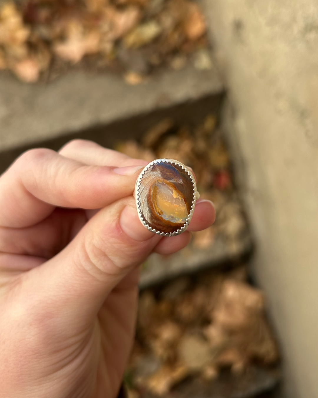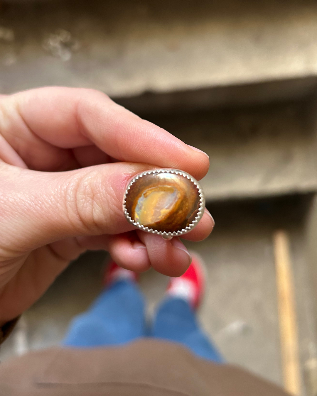 Set in a fine silver serrated bezel and finished with a slim, comfortable sterling band, this ring has a subtle profile while still offering rich movement and color. Perfect for everyday wear, stacking, or as a standout piece for lovers of natural, imperfect, desert-leaning stones.