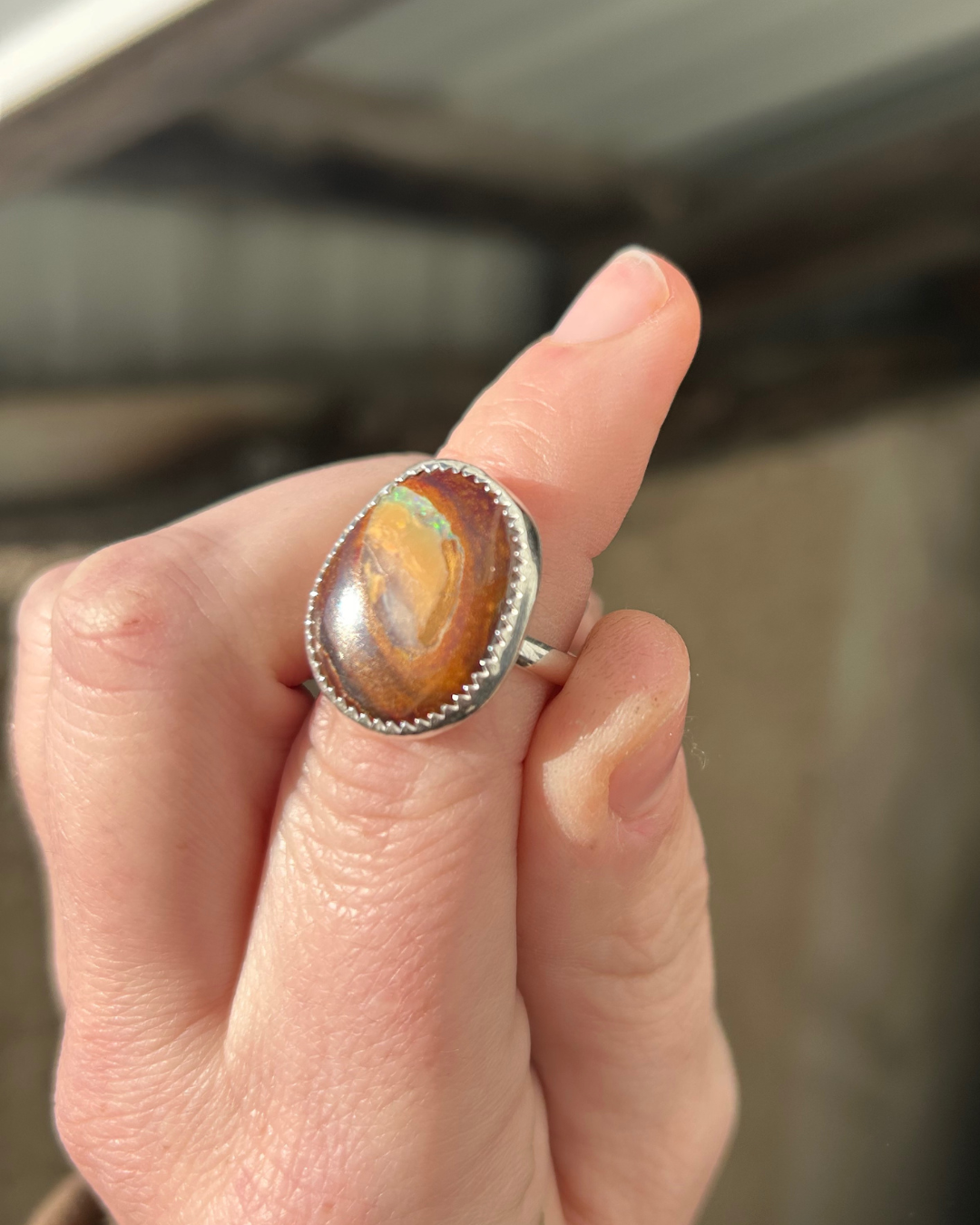 A warm, fire-kissed boulder opal sits at the center of this one-of-a-kind FOUNDRY ring — a stone that shifts from golden honey to flickers of rainbow flash in direct sunlight. Its earthy palette and natural matrix make it feel ancient, organic, and quietly precious.