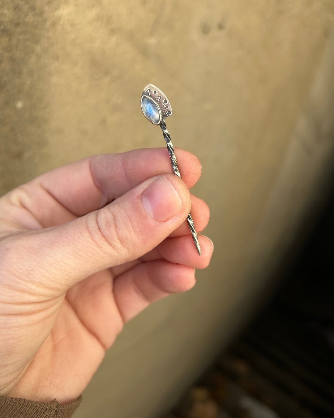 This one-of-a-kind Moonstone Cowboy Toothpick is hand-forged from sterling silver with a twisted stem, custom stamping, and a glowing natural moonstone with unmistakable blue flash. Each toothpick is shaped, stamped, soldered, and polished by hand — no two are ever alike.