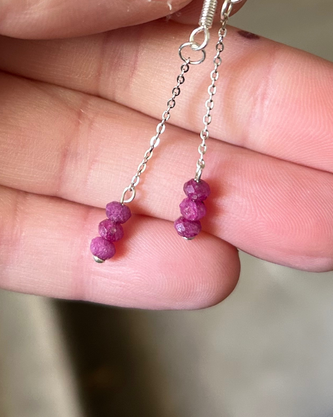 These delicate ruby chain earrings bring effortless sparkle to any day. These earrings feature three faceted raw ruby beads suspended from a slender sterling-silver chain, creating a soft, fluttery movement with every turn of the head. Light, elegant, and wearable with absolutely everything.