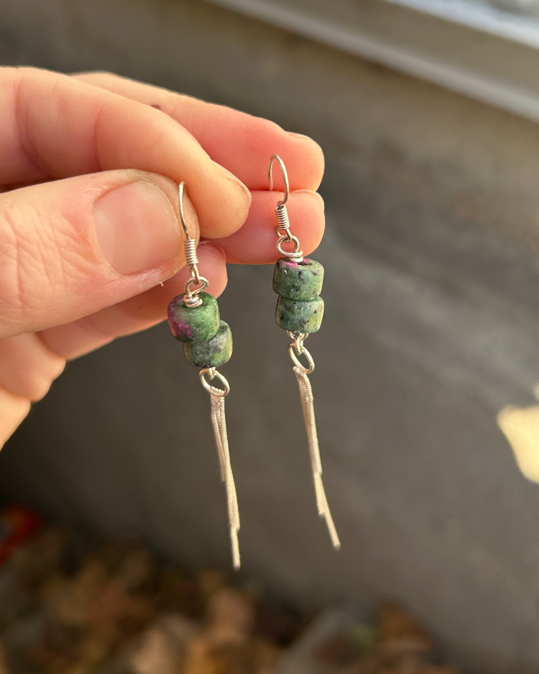 A moody, earthy take on the classic fringe earring. These Serpent Fringe earrings feature hand-selected ruby-in-zoisite beads, each showing rich blends of mossy green with natural berry-pink inclusions. Paired with flowing sterling snake chain, they move beautifully and feel effortless to wear.