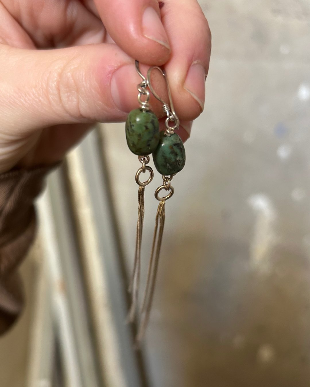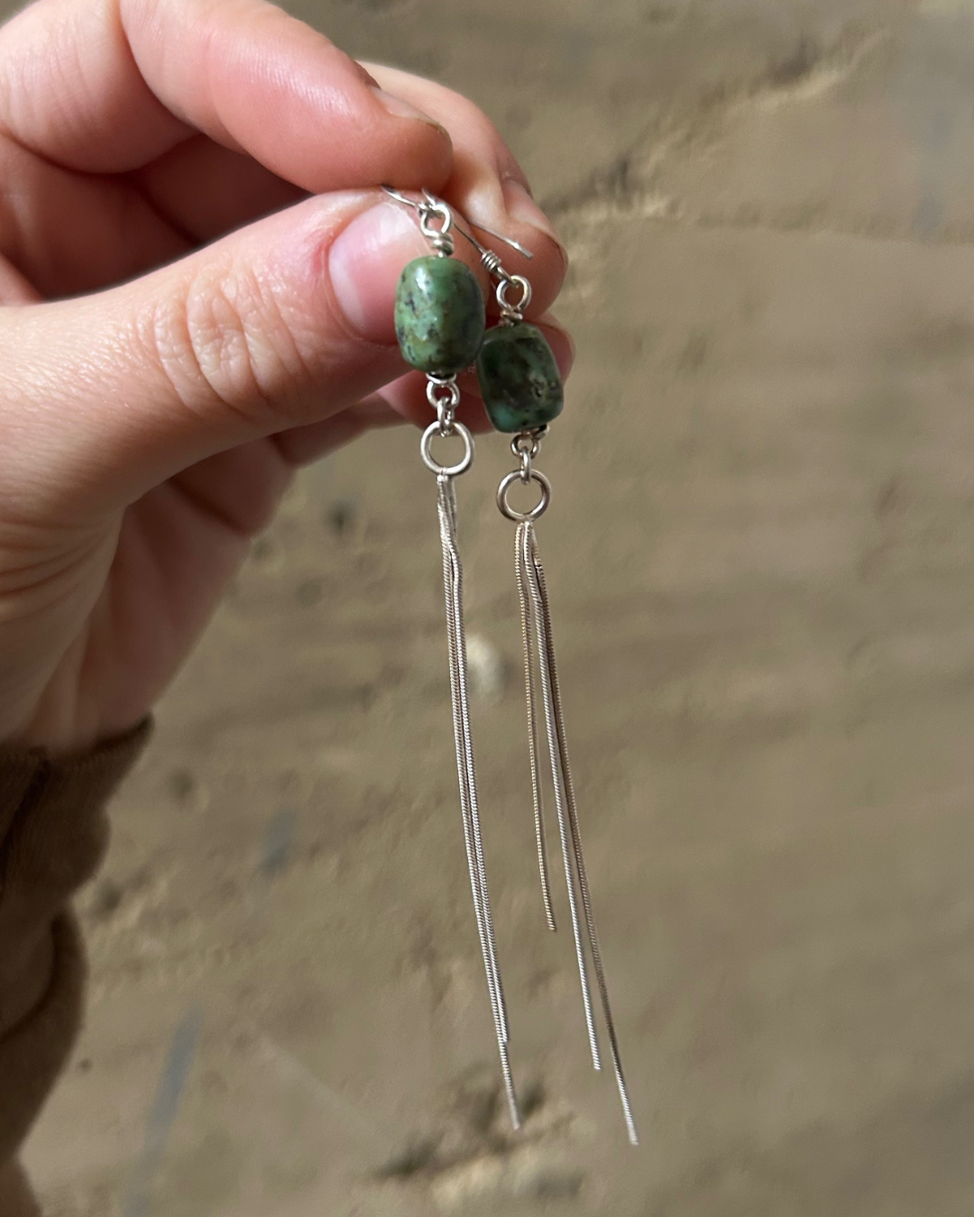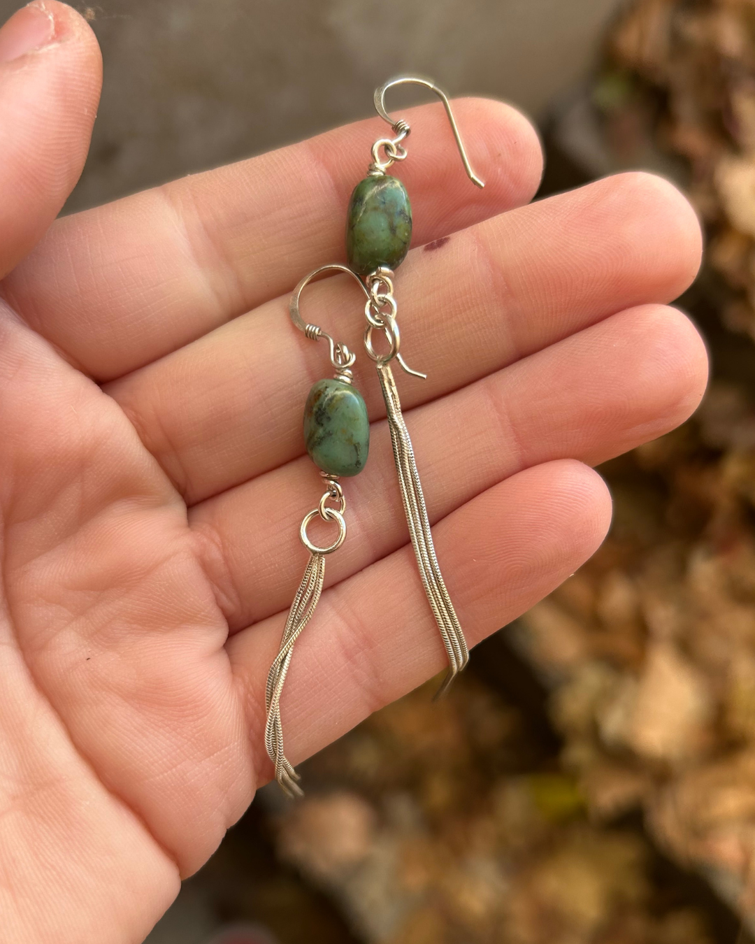A pair of earrings that feel alive with movement. These Serpent Fringe Turquoise Earrings feature natural turquoise nugget beads paired with sleek sterling silver snake-chain tassels that shimmer and sway with every step. Each earring is fully handcrafted, from the wrapped turquoise stones to the flowing chain fringe that creates a soft, liquid-metal effect.
