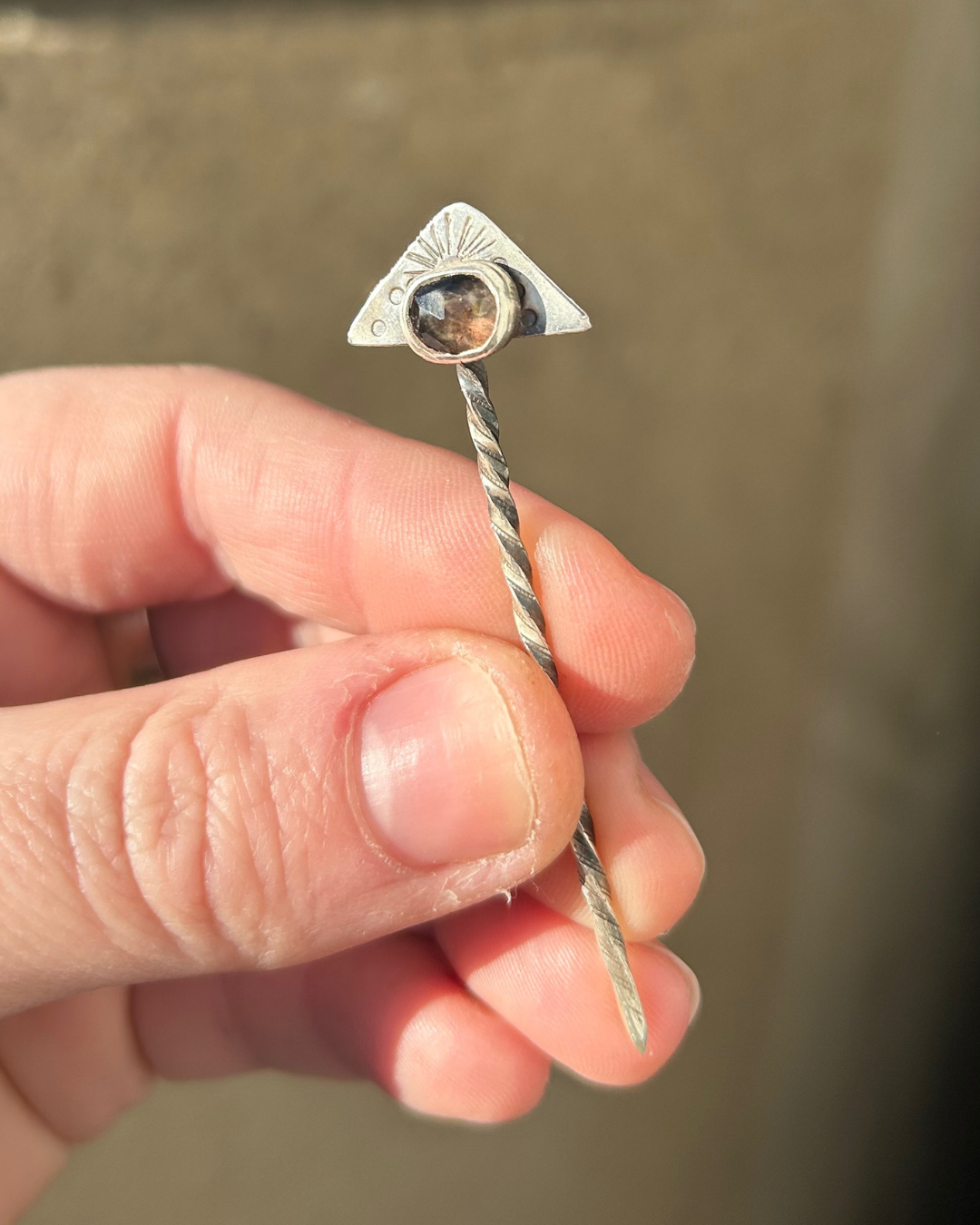 A one-of-a-kind cowboy toothpick built for everyday utility and western charm. This piece features a rose-cut smoky quartz set in sterling silver, topped with a hand-stamped triangle that gives the whole silhouette a subtle sun-rise feel.