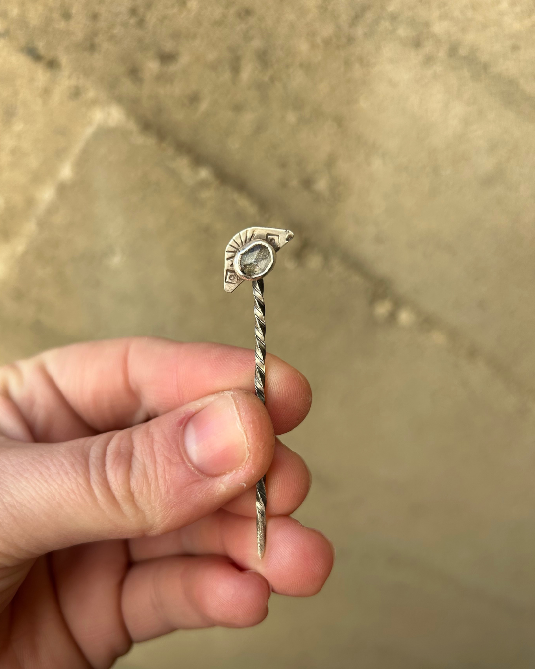This one-of-a-kind cowboy toothpick is hand-forged from solid sterling silver and topped with a natural rose-cut Umba sapphire. The twisted pick and stamped fan-style topper give it that classic Western feel while still feeling refined and heirloom-quality.