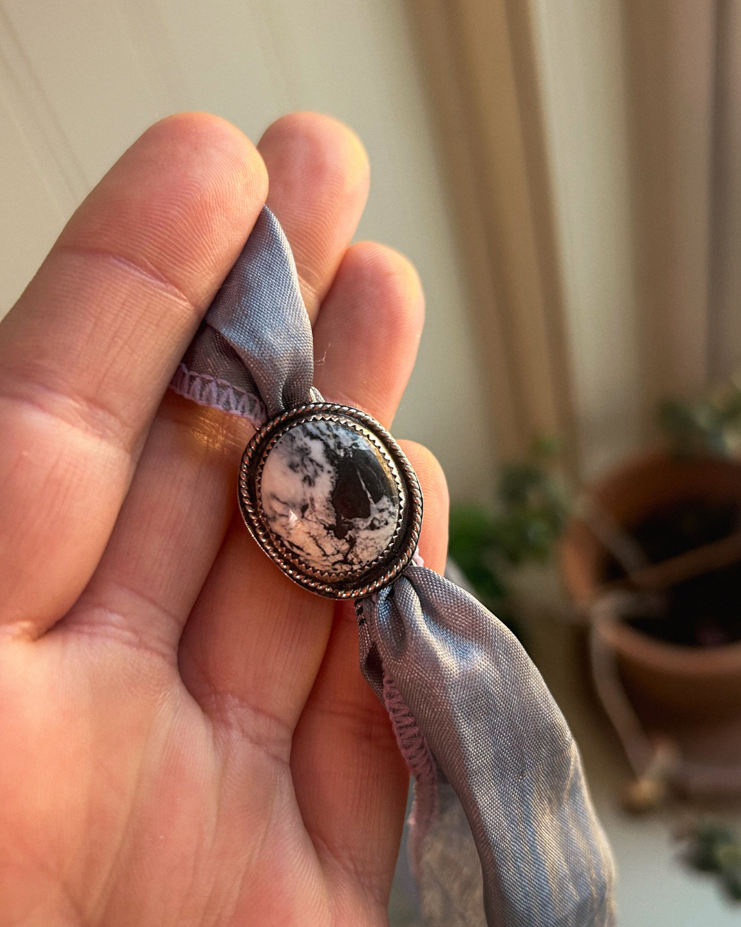 Soft silk against the skin with the grounding weight of stone and silver at the center.
