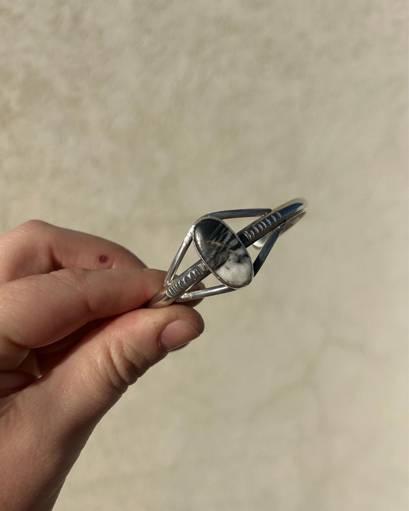 A bold, structured cuff built from solid 4-gauge sterling silver — thick, weighty, and made to last a lifetime. This piece features a long oval White Buffalo stone framed in a hand-forged bezel, with a split-shank design that gives it just the right balance of strength and softness.