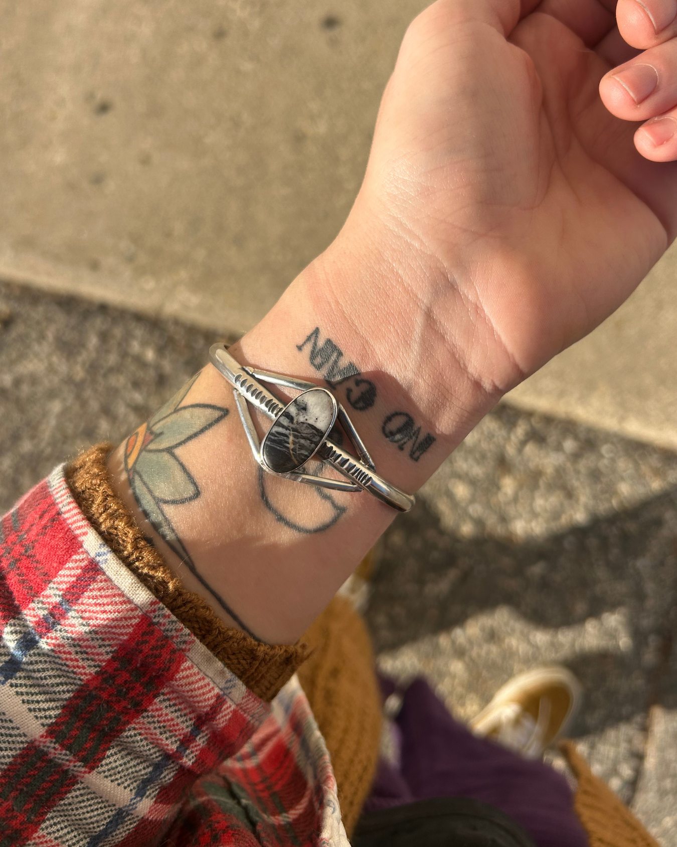 The cuff is shaped from heavy wire, hand-filed, soldered, and finished with stamped detailing at the center. The split architecture adds both comfort and visual lift, making the stone appear to float between the two rails of silver. Each line of oxidation and polish is done by hand, giving the cuff a clean but rugged finish.