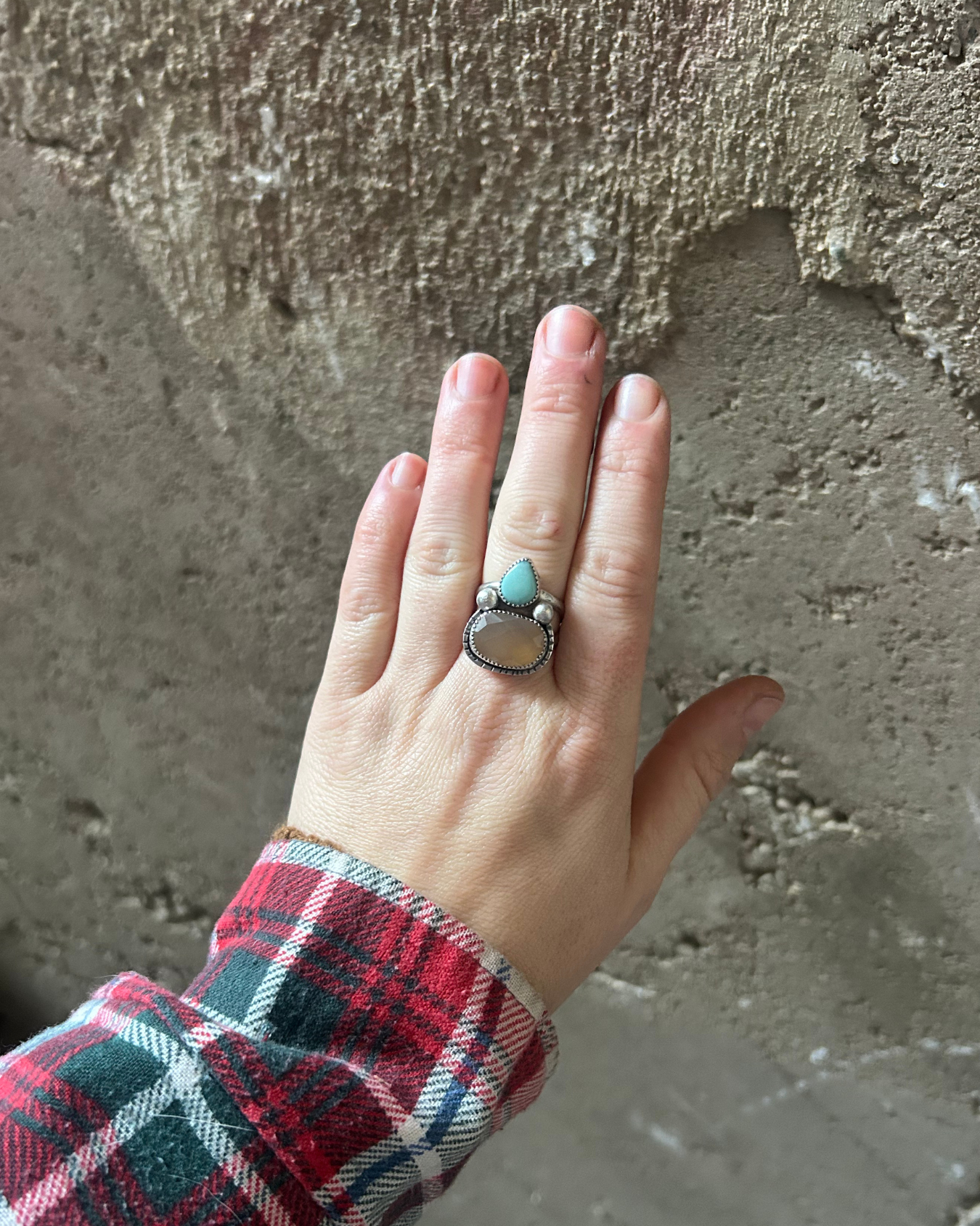 A one-of-a-kind ring that pairs White Water turquoise with a soft, glowing faceted peach moonstone—a combination that feels delicate, warm, and quietly striking.