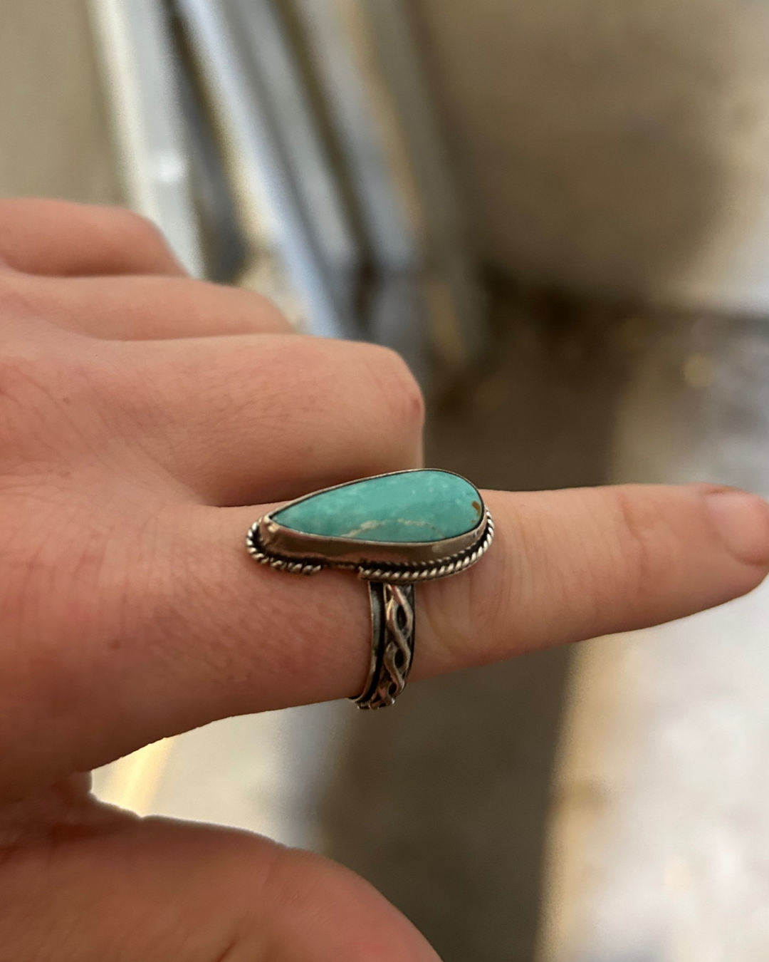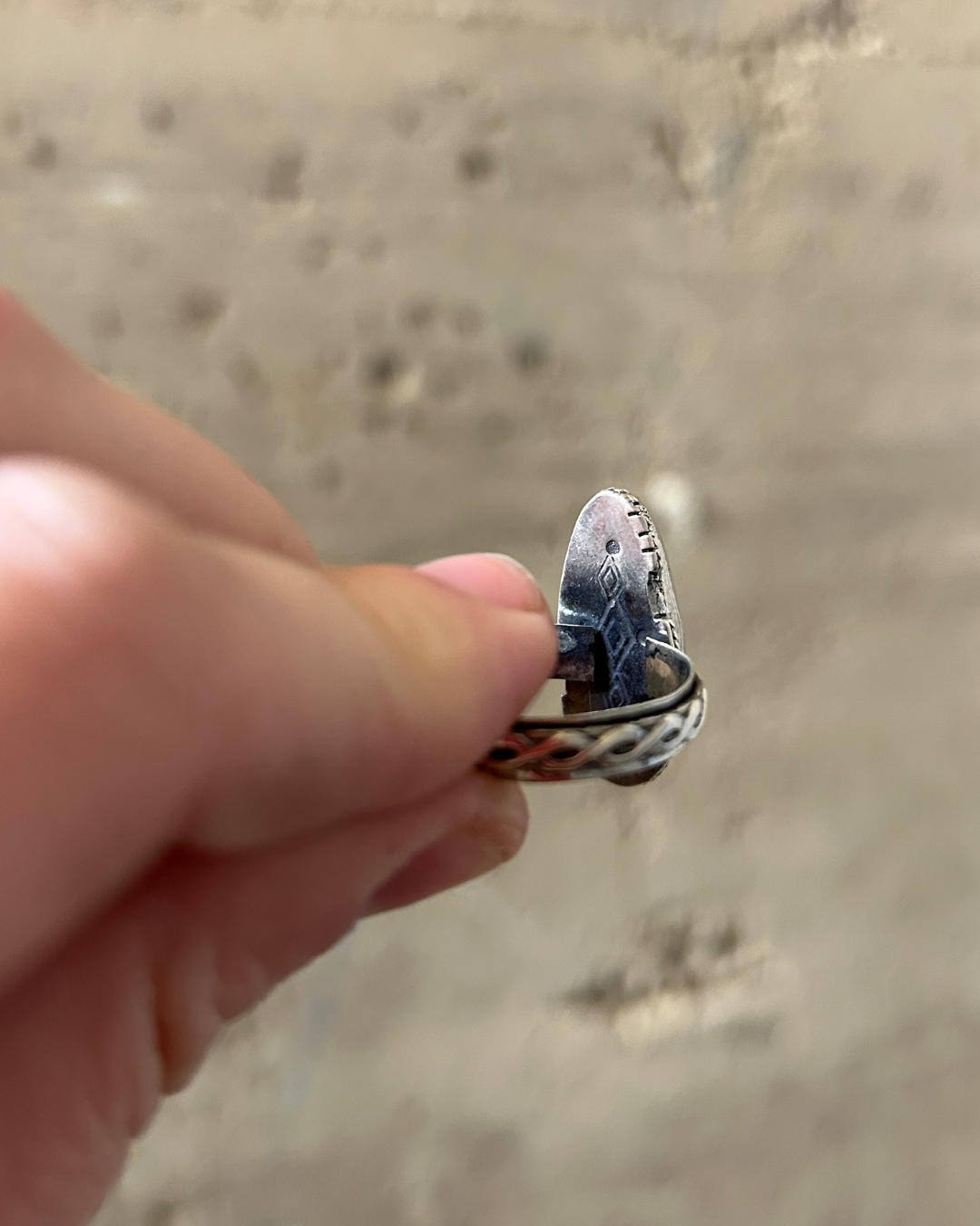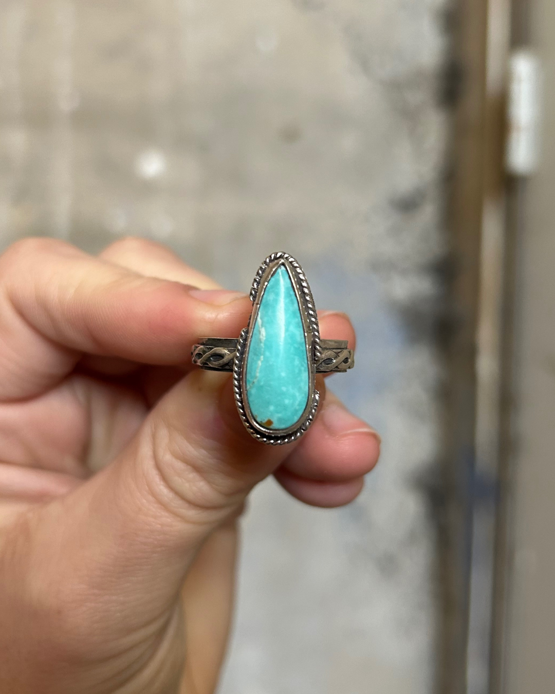 A one-of-a-kind men’s ring built around a striking Kingman Turquoise cabochon — bright blue with natural matrixing that feels alive on the hand. The band is fully handmade: two sterling wires soldered and shaped together into a woven pattern that feels both rugged and refined.